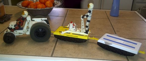 Here are some pictures of something I've been working on: the Mobile Launch Platform (not Pad, that might infringe). I've been wanting to try something like this for a while. Mattel was able to make the Mobile Launch Pad in one piece with the detailed treads. I couldn't figure out to do that so I found some treads from a green plastic Army tank. The treads are mounted on a rigid piece of Plexiglas. The upper shell is vacuum-formed from styrene and has holes for the three launchers' foot pads. The outriggers for the Satellite Launcher are made from Plexiglas. I decided to paint it yellow so that it wold contrast with all three launchers (white and gray). It has hitches on the front and rear that are compatible with the Astro Trak and the other MLP's. As soon as I finish the other two (and find a D cell battery) I'll shoot a video of this wagon train.
